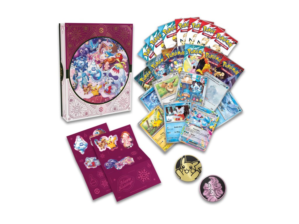 Balení obsahuje 25 dárků: 8 promo karet, 6 pokémon balíčků + 7 fun packů a 4 doplňky - nálepky a žetony. Klasické Pokémon balíčky jsou zastoupeny takto: 2x Destined Rivals, 1x Journey Together, 1x Surging Sparks, 1x Stellar Crown, 1x Twillight Masquerade.